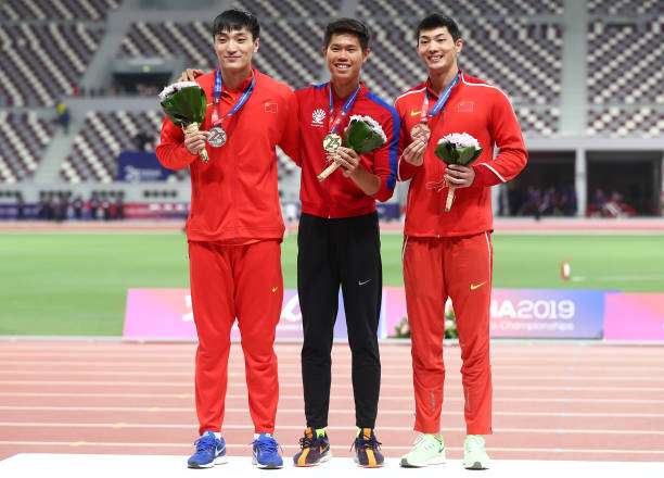 Ernest John Obeina of the Philippines (C), Zhang Wei of China (L), and Huang Bokai of China (R) attend the podium ceremony after winning first, second, and third places respectively in the men’s pole vault during 23rd Asian Athletics Championships at Khalifa International Stadium in the Qatari capital Doha on April 21, 2019. (Photo by Karim JAAFAR / AFP) (Photo credit should read KARIM JAAFAR/AFP via Getty Images)BERLIN, GERMANY – FEBRUARY 05: Ernest John Obiena of Philippines celebrates after victory in the Men’s Pole Vault during the ISTAD Indoor Berlin Meeting at Mercedes Benz Arena on February 05, 2021 in Berlin, Germany. Sporting stadiums around Germany remain under strict restrictions due to the Coronavirus Pandemic as Government social distancing laws prohibit fans inside venues resulting in events occurring behind closed doors. (Photo by Maja Hitij/Getty Images)TOKYO, JAPAN – JULY 31: Ernest John Obiena of Team Philippines celebrates as he competes in the Men’s Pole Vault Qualification on day eight of the Tokyo 2020 Olympic Games at Olympic Stadium on July 31, 2021 in Tokyo, Japan. (Photo by Maja Hitij/Getty Images)