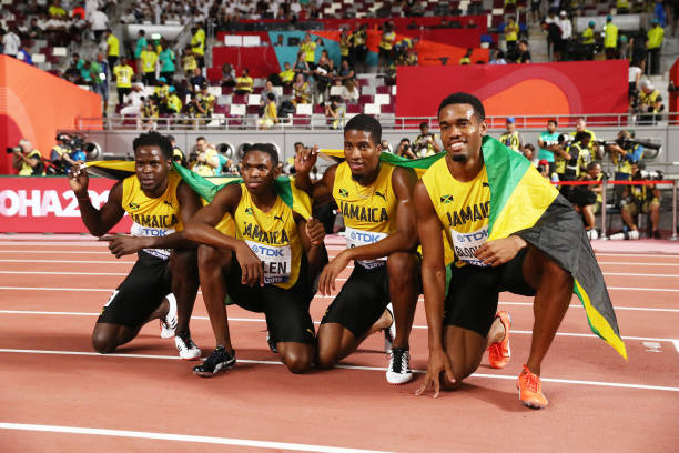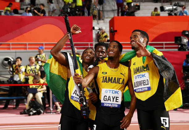 DOHA, QATAR – OCTOBER 06: Akeem Bloomfield, Nathon Allen, Terry Ricardo Thomas, and Demish Gaye of Jamaica celebrate winning silver in the Men’s 4×400 metres relay final during day ten of 17th IAAF World Athletics Championships Doha 2019 at Khalifa International Stadium on October 06, 2019 in Doha, Qatar. (Photo by Patrick Smith/Getty Images)DOHA, QATAR – OCTOBER 06: Akeem Bloomfield, Nathon Allen, Terry Ricardo Thomas, and Demish Gaye of Jamaica celebrate winning silver in the Men’s 4×400 metres relay final during day ten of 17th IAAF World Athletics Championships Doha 2019 at Khalifa International Stadium on October 06, 2019 in Doha, Qatar. (Photo by Alexander Hassenstein/Getty Images for IAAF)DOHA, QATAR – OCTOBER 06: Akeem Bloomfield, Nathon Allen, Terry Ricardo Thomas, and Demish Gaye of Jamaica celebrate winning silver in the Men’s 4×400 metres relay final during day ten of 17th IAAF World Athletics Championships Doha 2019 at Khalifa International Stadium on October 06, 2019 in Doha, Qatar. (Photo by Alexander Hassenstein/Getty Images for IAAF)