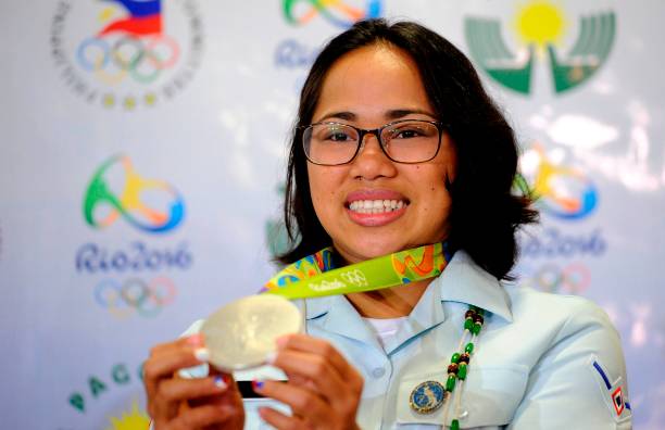 This picture taken on May 21, 2021 shows Olympic weightlifter Hidilyn Diaz of the Philippines lifting weights during a training session in Jasin in the Malaysian city of Malacca. – Filipina weightlifter Hidilyn Diaz, who took silver at Rio 2016, has been stuck in Malaysia since February last year because of the coronavirus pandemic but has remained determined to realise her dream of becoming the first Olympic gold medal winner from the Philippines. – To go with ‘OLY-2020-2021-WEIGHTLIFTING-PHILIPPINES,INTERVIEW’ (Photo by Mohd RASFAN / AFP) / To go with ‘OLY-2020-2021-WEIGHTLIFTING-PHILIPPINES,INTERVIEW’ (Photo by MOHD RASFAN/AFP via Getty Images)Philippines’ Hidilyn Diaz competes in the women’s 55kg weightlifting competition during the Tokyo 2020 Olympic Games at the Tokyo International Forum in Tokyo on July 26, 2021. (Photo by Vincenzo PINTO / AFP) (Photo by VINCENZO PINTO/AFP via Getty Images)Philippines’ Hidilyn Diaz competes in the women’s 55kg weightlifting competition during the Tokyo 2020 Olympic Games at the Tokyo International Forum in Tokyo on July 26, 2021. (Photo by Vincenzo PINTO / AFP) (Photo by VINCENZO PINTO/AFP via Getty Images)Philippine silver medallist at the Rio Olympics, Hidilyn Diaz shows her medal during a press conference as she arrives at the Manila International Airport in Manila on August 11, 2016.
