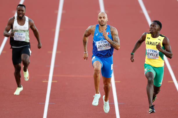 EUGENE, OREGON – JULY 15: Dorian Keletela of Team Athlete Refugee, Lamont Marcell Jacobs of Team Italy, and Oblique Seville of Team Jamaica compete in the Men’s 100 Meter heats on day one of the World Athletics Championships Oregon22 at Hayward Field on July 15, 2022 in Eugene, Oregon. (Photo by Steph Chambers/Getty Images)BIRMINGHAM, ENGLAND – AUGUST 06: (L-R) Silver medalist Jaheel Hyde of Team Jamaica, Gold medalist Kyron McMaster of Team British Virgin Islands and bronze medalist Alastair Chalmers of Team Guernsey celebrate during the medal ceremony for the Men’s 400m Hurdles Final on day nine of the Birmingham 2022 Commonwealth Games at Alexander Stadium on August 06, 2022 on the Birmingham, England. (Photo by Michael Steele/Getty Images)