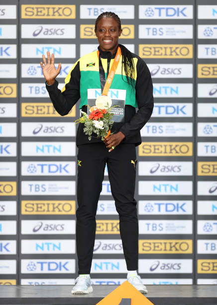 BUDAPEST, HUNGARY – AUGUST 22: Bronze medalist Shelly-Ann Fraser-Pryce of Team Jamaica poses for a photo during the medal ceremony for the Women’s 100m during day four of the World Athletics Championships Budapest 2023 at National Athletics Centre on August 22, 2023 in Budapest, Hungary. (Photo by Sam Mellish/Getty Images)BUDAPEST, HUNGARY – AUGUST 24: Antonio Watson of Team Jamaica celebrates winning the Men’s 400m Final during day six of the World Athletics Championships Budapest 2023 at National Athletics Centre on August 24, 2023 in Budapest, Hungary. (Photo by David Ramos/Getty Images)