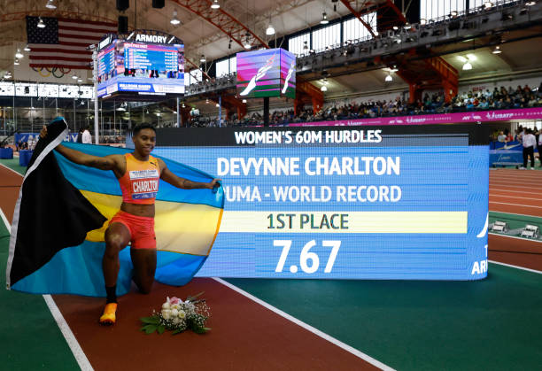 NEW YORK, NEW YORK – FEBRUARY 11: Devynne Charlton of the Bahamas sets the worlds record of 7.67 winning the Women’s 60m Hurdles during the 116th Millrose Games at The Armory Track on February 11, 2024 in New York City. (Photo by Al Bello/Getty Images)NEW YORK, NEW YORK – FEBRUARY 11: Devynne Charlton of the Bahamas sets the worlds record of 7.67 winning the Women’s 60m Hurdles during the 116th Millrose Games at The Armory Track on February 11, 2024 in New York City. (Photo by Al Bello/Getty Images)