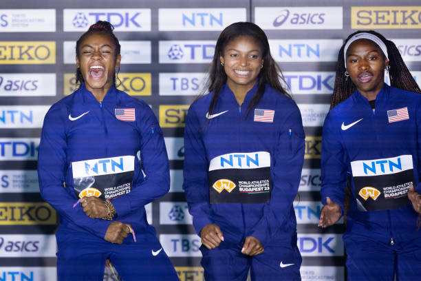 BUDAPEST, HUNGARY: August 27: Members of the The United States Womens 4x 100m Relay gold medal winning team, from left, Sha’Carri Richardson, Gabrielle Thomas and Twanisha Terry, on the podium during the medal ceremony at the medal plaza during the World Athletics Championships, at the National Athletics Centre on August 27th, 2023 in Budapest, Hungary. (Photo by Tim Clayton/Corbis via Getty Images)BUDAPEST, HUNGARY: August 26: Gabrielle Thomas and Twanisha Terry of the United States celebrate The United States 4x 100m Relay teams gold medal win during the World Athletics Championships, at the National Athletics Centre on August 26th, 2023 in Budapest, Hungary. (Photo by Tim Clayton/Corbis via Getty Images)