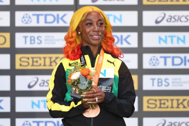 BUDAPEST, HUNGARY – AUGUST 22: Bronze medalist Shelly-Ann Fraser-Pryce of Team Jamaica poses for a photo during the medal ceremony for the Women’s 100m during day four of the World Athletics Championships Budapest 2023 at National Athletics Centre on August 22, 2023 in Budapest, Hungary. (Photo by Sam Mellish/Getty Images)BUDAPEST, HUNGARY – AUGUST 22: Bronze medalist Shelly-Ann Fraser-Pryce of Team Jamaica poses for a photo during the medal ceremony for the Women’s 100m during day four of the World Athletics Championships Budapest 2023 at National Athletics Centre on August 22, 2023 in Budapest, Hungary. (Photo by Christian Petersen/Getty Images for World Athletics)