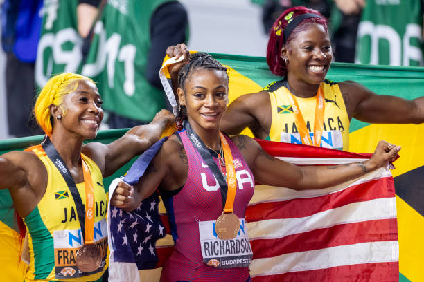 BUDAPEST, HUNGARY – AUGUST 22: Bronze medalist Shelly-Ann Fraser-Pryce of Team Jamaica poses for a photo during the medal ceremony for the Women’s 100m during day four of the World Athletics Championships Budapest 2023 at National Athletics Centre on August 22, 2023 in Budapest, Hungary. (Photo by Christian Petersen/Getty Images for World Athletics)BUDAPEST, HUNGARY: August 21: Gold medal winner Sha’Carri Richardson of the United States with silver medal winner Shericka Jackson of Jamaica and bronze medal winner Shelly-Ann Fraser-Pryce of Jamaica after the Women’s 100m Final during the World Athletics Championships, at the National Athletics Centre on August 21st, 2023 in Budapest, Hungary. (Photo by Tim Clayton/Corbis via Getty Images)