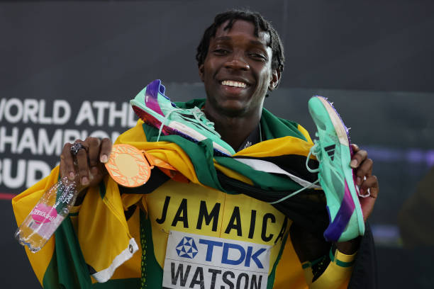 BUDAPEST, HUNGARY – AUGUST 24: Antonio Watson of Team Jamaica celebrates winning the Men’s 400m Final during day six of the World Athletics Championships Budapest 2023 at National Athletics Centre on August 24, 2023 in Budapest, Hungary. (Photo by Stephen Pond/Getty Images for World Athletics)BUDAPEST, HUNGARY – AUGUST 25: Gold medalist Antonio Watson of Team Jamaica celebrates on the podium during the medals ceremony for the Men’s 400m during day seven of the World Athletics Championships Budapest 2023 at National Athletics Centre on August 25, 2023 in Budapest, Hungary. (Photo by Christian Petersen/Getty Images for World Athletics)
