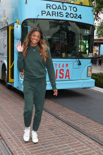 BUDAPEST, HUNGARY – AUGUST 18: Gabrielle Thomas of Team United States reacts during a training session ahead of the World Athletics Championships Budapest 2023 at National Athletics Centre on August 18, 2023 in Budapest, Hungary. (Photo by Patrick Smith/Getty Images)LOS ANGELES, CALIFORNIA – NOVEMBER 18: Gabby Thomas during the Team USA Road to Paris Bus Tour on November 18, 2023 in Los Angeles, California. (Photo by Joe Scarnici/Getty Images for NBC)