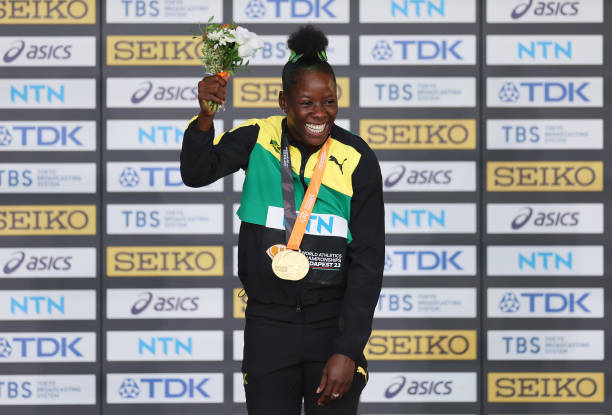 BUDAPEST, HUNGARY – AUGUST 26: Gold medalist Shericka Jackson of Team Jamaica celebrates with their gold medal on the podium after the Women’s 200m Final during day eight of the World Athletics Championships Budapest 2023 at National Athletics Centre on August 26, 2023 in Budapest, Hungary. (Photo by Christian Petersen/Getty Images for World Athletics)BUDAPEST, HUNGARY – AUGUST 20: Shericka Jackson of Team Jamaica competes in the Women’s 100m Heats during day two of the World Athletics Championships Budapest 2023 at National Athletics Centre on August 20, 2023 in Budapest, Hungary. (Photo by Steph Chambers/Getty Images)