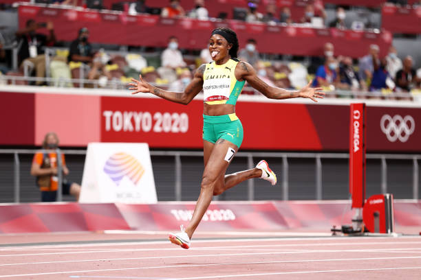 TOKYO, JAPAN – JULY 31: Elaine Thompson-Herah of Team Jamaica celebrates after winning the gold medal in the Women’s 100m Final on day eight of the Tokyo 2020 Olympic Games at Olympic Stadium on July 31, 2021 in Tokyo, Japan. (Photo by Cameron Spencer/Getty Images)TOKYO, JAPAN – AUGUST 03: Elaine Thompson-Herah of Team Jamaica wins the gold medal in the Women’s 200m Final on day eleven of the Tokyo 2020 Olympic Games at Olympic Stadium on August 03, 2021 in Tokyo, Japan. (Photo by Ryan Pierse/Getty Images)