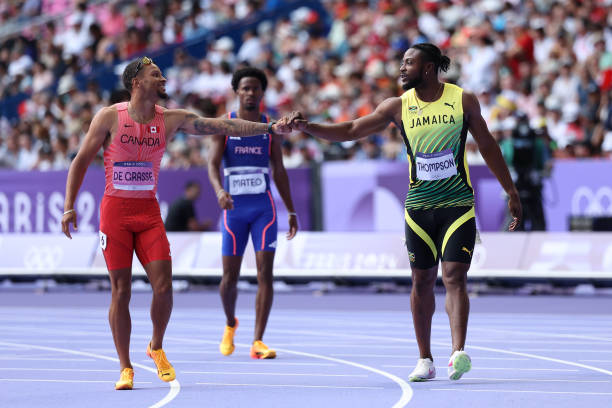 PARIS, FRANCE – AUGUST 08: Kishane Thompson of Team Jamaica react following the Men’s 4 x 100m Relay on day thirteen of the Olympic Games Paris 2024 at Stade de France on August 08, 2024 in Paris, France. (Photo by Michael Steele/Getty Images)PARIS, FRANCE – AUGUST 08: Kishane Thompson of Team Jamaica (R) congratulates Andre de Grasse of Team Canada after competing in the Men’s 4 x 100m Relay on day thirteen of the Olympic Games Paris 2024 at Stade de France on August 08, 2024 in Paris, France. (Photo by Cameron Spencer/Getty Images)