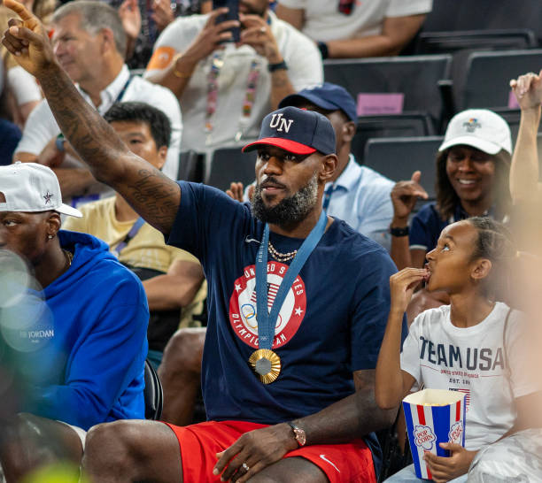 PARIS, FRANCE: AUGUST 11: LeBron James, wearing his gold medal, on the sideline sharing popcorn with daughter Zhuri Nova during the United States of America vs France Women’s Basketball Gold Medal Game at the Bercy Arena during the Paris 2024 Summer Olympic Games on August 11th, 2024 in Paris, France. (Photo by Tim Clayton/Corbis via Getty Images)PARIS, FRANCE – AUGUST 11: Gold medalist LeBron James of Team United States celebrate on the podium during the Men’s basketball medal ceremony on day fifteen of the Olympic Games Paris 2024 at the Bercy Arena on August 11, 2024 in Paris, France. (Photo by Tom Weller/VOIGT/GettyImages)