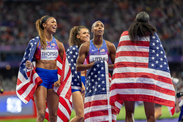 PARIS, FRANCE: AUGUST 10: Sydney McLaughlin-Levrone of the United States celebrates her team’s gold medal win in the Women’s 4 x 400m Relay Final during the Athletics Competition at the Stade de France during the Paris 2024 Summer Olympic Games on August 10th, 2024, in Paris, France. (Photo by Tim Clayton/Corbis via Getty Images)PARIS, FRANCE: AUGUST 10: Gabby Thomas, Sydney McLaughlin-Levrone, Alexis Holmes and Shamier Little of the United States celebrate the team’s gold medal win in the Women’s 4 x 400m Relay Final during the Athletics Competition at the Stade de France during the Paris 2024 Summer Olympic Games on August 10th, 2024, in Paris, France. (Photo by Tim Clayton/Corbis via Getty Images)