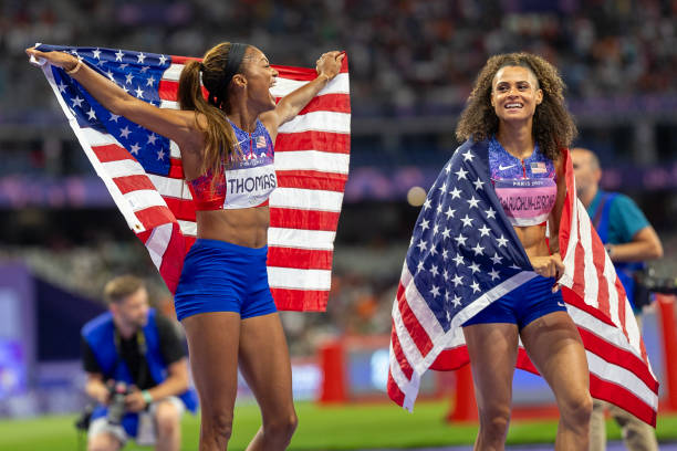 PARIS, FRANCE – AUGUST 04: Kishane Thompson of Jamaica reacts after the Men’s 100m Final on day nine of the Olympic Games Paris 2024 at Stade de France on August 04, 2024 in Paris, France. (Photo by Christian Liewig – Corbis/Corbis via Getty Images)PARIS, FRANCE: AUGUST 10: Gabby Thomas and Sydney McLaughlin-Levrone of the United States celebrate the team’s gold medal win in the Women’s 4 x 400m Relay Final during the Athletics Competition at the Stade de France during the Paris 2024 Summer Olympic Games on August 10th, 2024, in Paris, France. (Photo by Tim Clayton/Corbis via Getty Images)