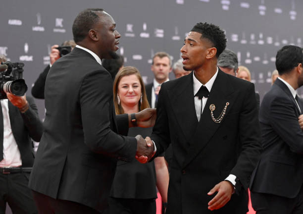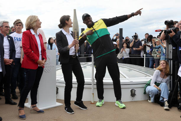 PARIS, FRANCE – JULY 25: (L-R) Ile-de-France Regional Council President Valerie Pecresse, Amélie Oudéa Castéra, French Minister for Sport, and former sprinter Usain Bolt pose with the Olympic torch during a Pre-Olympic tour along the Seine with the Eiffel Tower in the background on July 25, 2023 in Paris, France. On July 26, 2024, for the first time in the history of the Summer Olympic Games, the opening ceremony will not be taking place in a stadium but the parade of athletes will be held on the Seine, with boats for each national delegation. Paris will host the Summer Olympics from July 26 till August 11, 2024. (Photo by Catherine Steenkeste/Getty Images)TOPSHOT – Jamaican sprinter Usain Bolt and Real Madrid’s English midfielder #5 Jude Bellingham (R) shake hands on the Red Carpet ahead of the 25th Laureus World Sports Awards gala in Madrid on April 22, 2024. (Photo by JAVIER SORIANO / AFP) (Photo by JAVIER SORIANO/AFP via Getty Images)