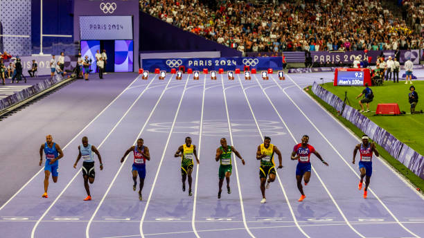 PARIS, FRANCE: AUGUST 04: Noah Lyles of the United States winning the gold medal in the Men’s 100m Final flanked by Letsile Tebogo of Botswana, Oblique Seville of Jamaica and Akani Simbine of South Africa during the Athletics Competition at the Stade de France during the Paris 2024 Summer Olympic Games on August 4th, 2024 in Paris, France. (Photo by Tim Clayton/Corbis via Getty Images)PARIS, FRANCE – AUGUST 4: (L-R) Lamont Marcell Jacobs of Italy, Letsile Tebogo of Botswana, Noah Lyles of United States, Oblique Seville of Jamaica, Akani Simbine of South Africa, Kishane Thompson of Jamaica, Fred Kerley of Unites States and Kenneth Bednarek of Unites States compete in the men’s 100 meters final on day nine of the Olympic Games Paris 2024 at Stade de France on August 4, 2024 in Paris, France. (Photo by Sam Mellish/Getty Images)