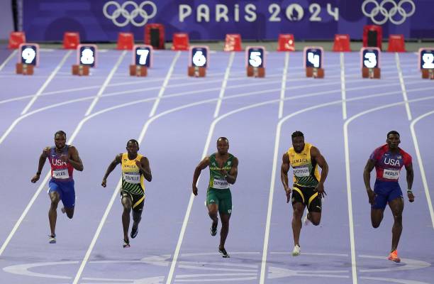 PARIS, FRANCE – AUGUST 4: (L-R) Lamont Marcell Jacobs of Italy, Letsile Tebogo of Botswana, Noah Lyles of United States, Oblique Seville of Jamaica, Akani Simbine of South Africa, Kishane Thompson of Jamaica, Fred Kerley of Unites States and Kenneth Bednarek of Unites States compete in the men’s 100 meters final on day nine of the Olympic Games Paris 2024 at Stade de France on August 4, 2024 in Paris, France. (Photo by Sam Mellish/Getty Images)L to R Noah Lyles of the United States, Oblique Seville of Jamaica, Akani Simbine of South Africa, Kishane Thompson of Jamaica, Fred Kerley of the United States compete during the men’s 100m final of Athletics at the Paris 2024 Olympic Games in Paris, France, Aug. 4, 2024. (Photo by Sun Fei/Xinhua via Getty Images)