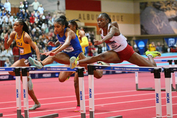 BUDAPEST, HUNGARY – AUGUST 23: Ackera Nugent of Team Jamaica competes in the Women’s 100m Hurdles Semi-Final during day five of the World Athletics Championships Budapest 2023 at National Athletics Centre on August 23, 2023 in Budapest, Hungary. (Photo by Patrick Smith/Getty Images)ALBUQUERQUE, NM – MARCH 11: Masai Russell of the Kentucky Wildcats and Ackera Nugent of the Arkansas Razorbacks compete in the Women’s 60 Meter Hurdles final during the 2023 Division I Men’s and Women’s Indoor Track & Field Championships held at the Albuquerque Convention Center on March 11, 2023 in Albuquerque, New Mexico. (Photo by Sam Wasson/NCAA Photos via Getty Images)