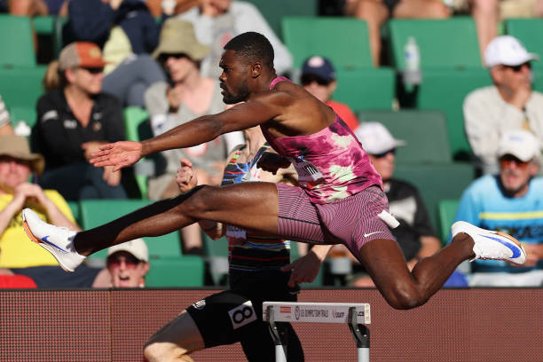 TOKYO, JAPAN – AUGUST 03: Karsten Warholm (C) of Norway competes in the Men’s 400m hurdles on day eleven of the Tokyo 2020 Olympic Games at Olympic Stadium on August 3, 2021 in Tokyo, Japan. (Photo by The Asahi Shimbun via Getty Images)EUGENE, OREGON – JUNE 28: Rai Benjamin competes in the men’s 400 meter hurdles semi-final on Day Eight of the 2024 U.S. Olympic Team Track & Field Trials at Hayward Field on June 28, 2024 in Eugene, Oregon. (Photo by Christian Petersen/Getty Images)