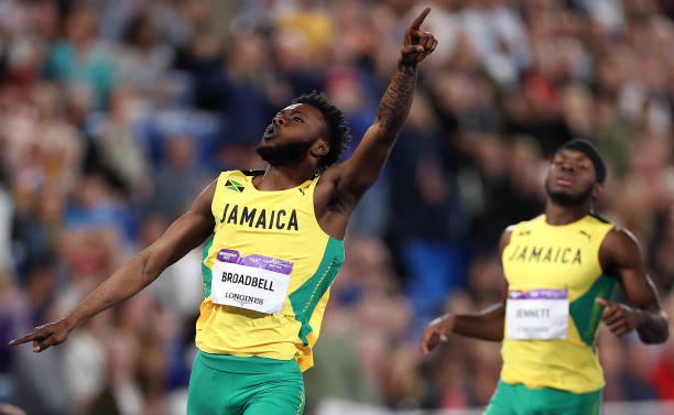 BIRMINGHAM, ENGLAND – AUGUST 04: Rasheed Broadbell of Team Jamaica celebrates after winning the gold medal in the Men’s 110m Hurdles Final on day seven of the Birmingham 2022 Commonwealth Games at Alexander Stadium on August 04, 2022 in Birmingham, England. (Photo by Ryan Pierse/Getty Images)ZURICH, SWITZERLAND – SEPTEMBER 08: Grant Holloway of United States (2R) jumps the last hurdle before Rasheed Broadbell of Jamaica and Hansle Parchment of Jamaica to win Men’s 110 Metres Hurdles during the Weltklasse Zurich 2022, part of the 2022 Diamond League series at Stadion Letzigrund on September 08, 2022 in Zurich, Switzerland. (Photo by Alexander Hassenstein/Getty Images)