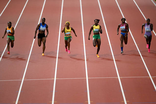 BUDAPEST, HUNGARY – AUGUST 21: Marie-Josee Ta Lou of Team Ivory Coast, Julien Alfred of Team Saint Lucia, Shelly-Ann Fraser-Pryce of Team Jamaica, Shericka Jackson of Team Jamaica, Brittany Brown of Team United States, and Dina Asher-Smith of Team Great Britain compete in the Women’s 100m Final during day three of the World Athletics Championships Budapest 2023 at National Athletics Centre on August 21, 2023 in Budapest, Hungary. (Photo by Hannah Peters/Getty Images)BUDAPEST, HUNGARY – AUGUST 25: Gabrielle Thomas of Team United States, Julien Alfred of Team Saint Lucia, and Shericka Jackson of Team Jamaica compete in the Women’s 200m Final during day seven of the World Athletics Championships Budapest 2023 at National Athletics Centre on August 25, 2023 in Budapest, Hungary. (Photo by Stephen Pond/Getty Images for World Athletics)